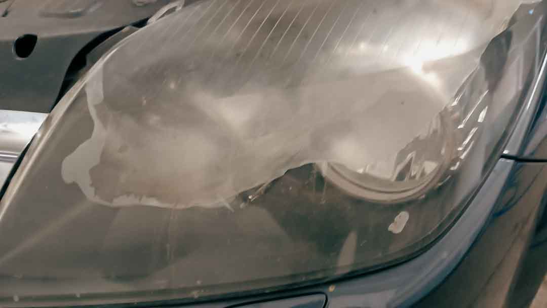 Um die vergilbten und matten Scheinwerfer wieder transparent und clean erscheinen zu lassen sind zwei Arbeitsschritte nötig. Dabei wird in einem ersten Arbeitsschritt die beschädigte Oberfläche abgeschliffen und in einem zweiten die geschliffene Oberfläche bedampft.